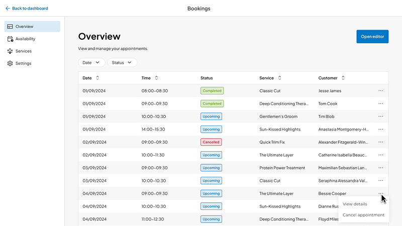 Simply open Website Builder, add the booking component, customise your services, set up availability, and you’re ready to accept bookings on your website!